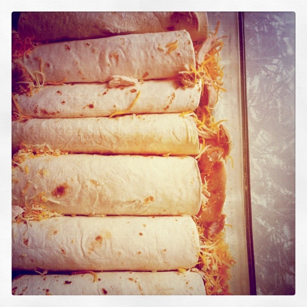 2. Mix chicken and 1 cup cheese. Roll up in tortillas and place in pan.